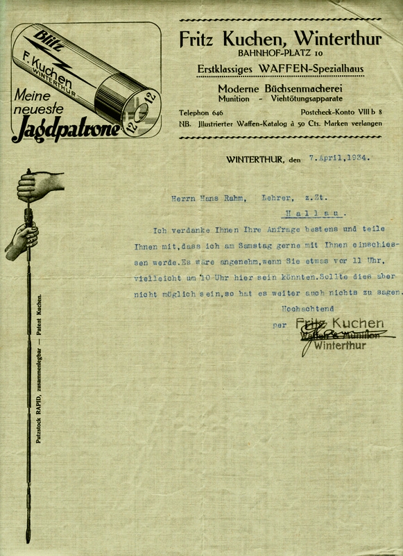 Der Weltmeister und Inhaber eines Waffengeschäftes, Fritz Kuchen, hat mit diesem Schreiben einen wichtigen, dringenden und unverschiebbaren Termin zum Einschiessen vereinbart ...